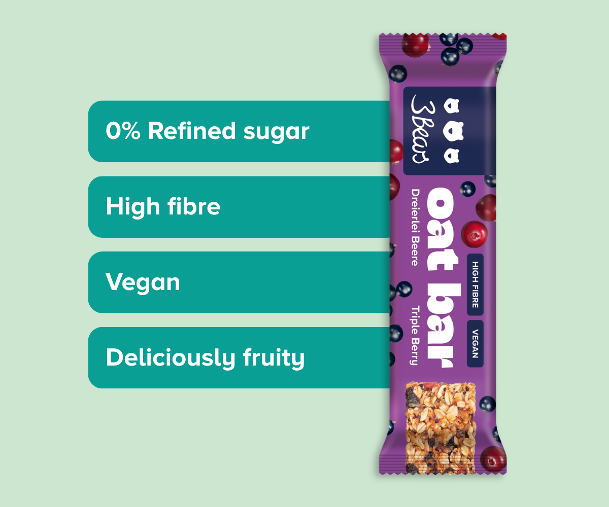 Our Oat Bars are more than just a snack – they are your faithful companion for on the go, after exercise or in between meals. Full of oats, fruity in taste and with the familiar 3Bears quality you love. Handy, delicious and always ready when you feel a craving coming on.