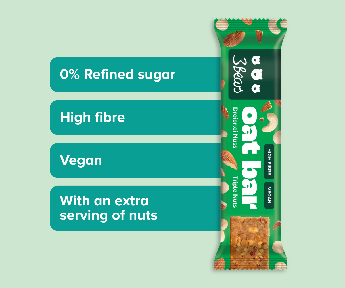 We founded 3Bears in 2016 because we were frustrated with how much sugar was in so many foods. We brought porridge to Germany because we think it's the perfect basis for a wholesome breakfast. You can now get pretty much everything to do with oats from us: overnight oats, bars, granola and accessories. And you can trust us to always stick to our principles. Our products contain no industrial sugar, no additives, they are always 100% plant-based and sustainability is deeply rooted in us.