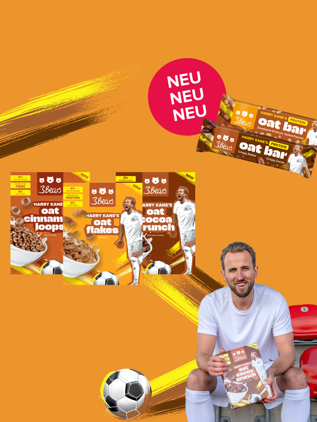 It's a match: Harry Kane, einer der berühmtesten Fußballspieler der Welt, wird Mitglied der 3Bears-Familie. Als leidenschaftlicher Fan von Porridge und allem, was mit Hafer zu tun hat, freut sich Harry darauf, seine Liebe zu nahrhaftem Frühstück mit dir zu teilen.