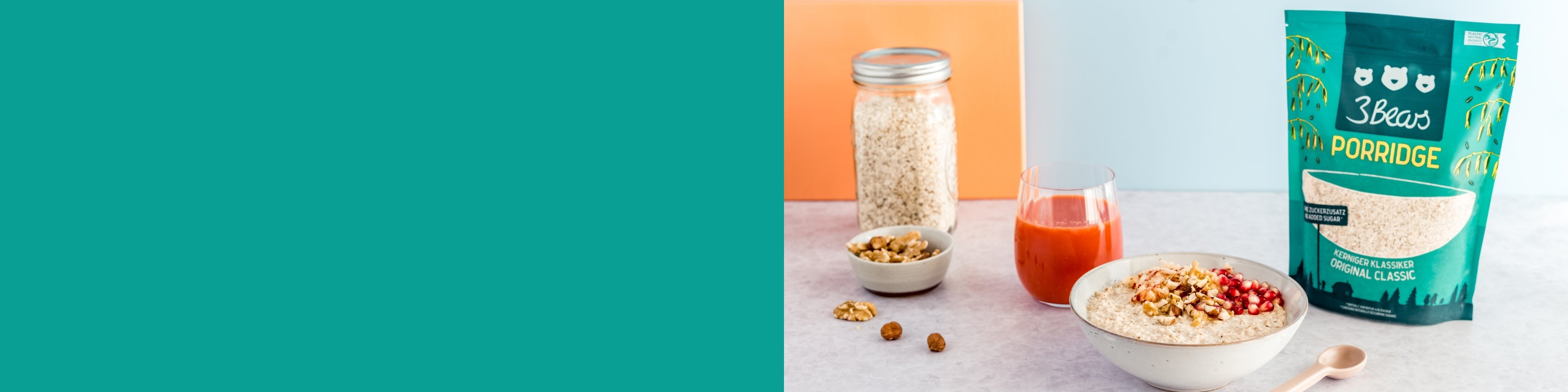- Das Wort PORRIDGE ist groß auf der Vorderseite platziert. Porridge selbst ist definiert als ein Brei, der zubereitet wird aus Haferflocken und Milch oder Wasser. Die Aufschrift „Ohne Zuckerzusatz“ ist eine Abgrenzung gegenüber anderen klassischen Porridge-Mischungen, bei welchen Zucker zugesetzt wird. Davon wollen wir uns differenzieren. Die Aufschrift “ohne Zuckerzusatz“ wird so u.a. auch in der Kategorie der Fruchtsäfte eingesetzt, in welcher es Säfte aus 100% Frucht, aber eben auch mit zugesetztem Zucker gibt oder aus Konzentrat.