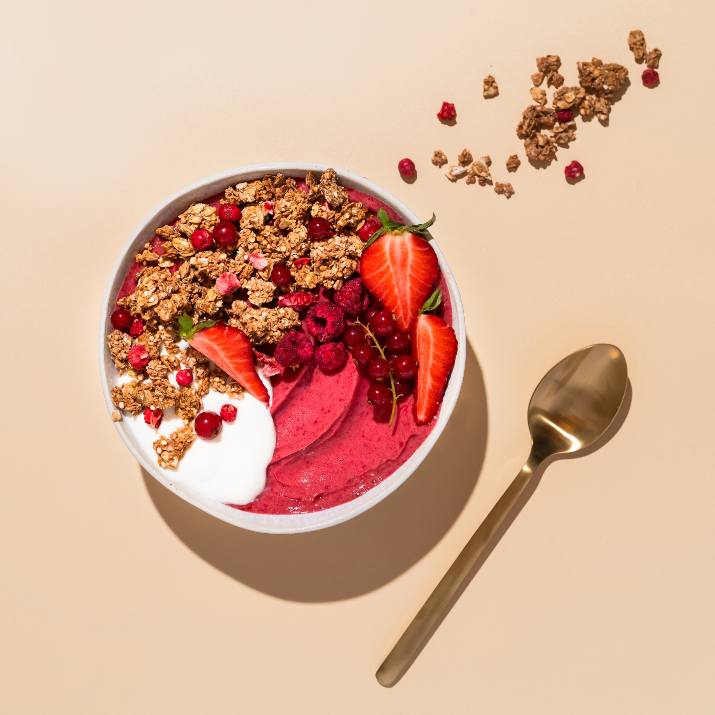 - Knuspriges Granola aus Vollkorn-Haferflocken mit gefriergetrockneten Erdbeeren & roten Johannisbeeren, Quinoa und Amaranth