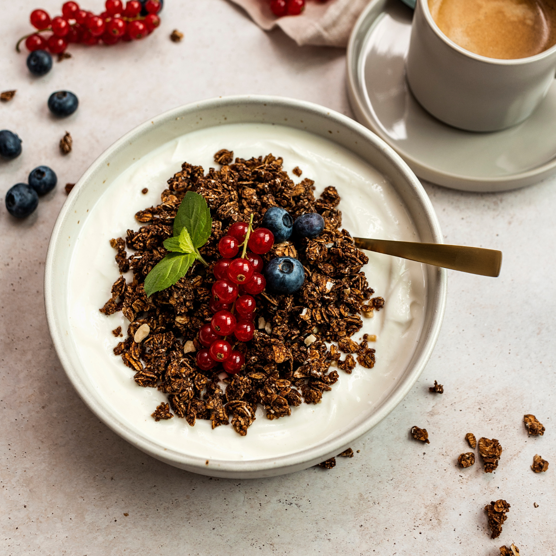 Granola ist eine knusprige Müsli-Mischung mit gerösteten Haferflocken als Basis. Es ist ein leckeres Frühstück oder Snack, welcher reich an Ballaststoffen. Granola wird häufig mit Joghurt, Milch oder Pflanzendrinks serviert und bietet einen leckeren Crunch und Süße.