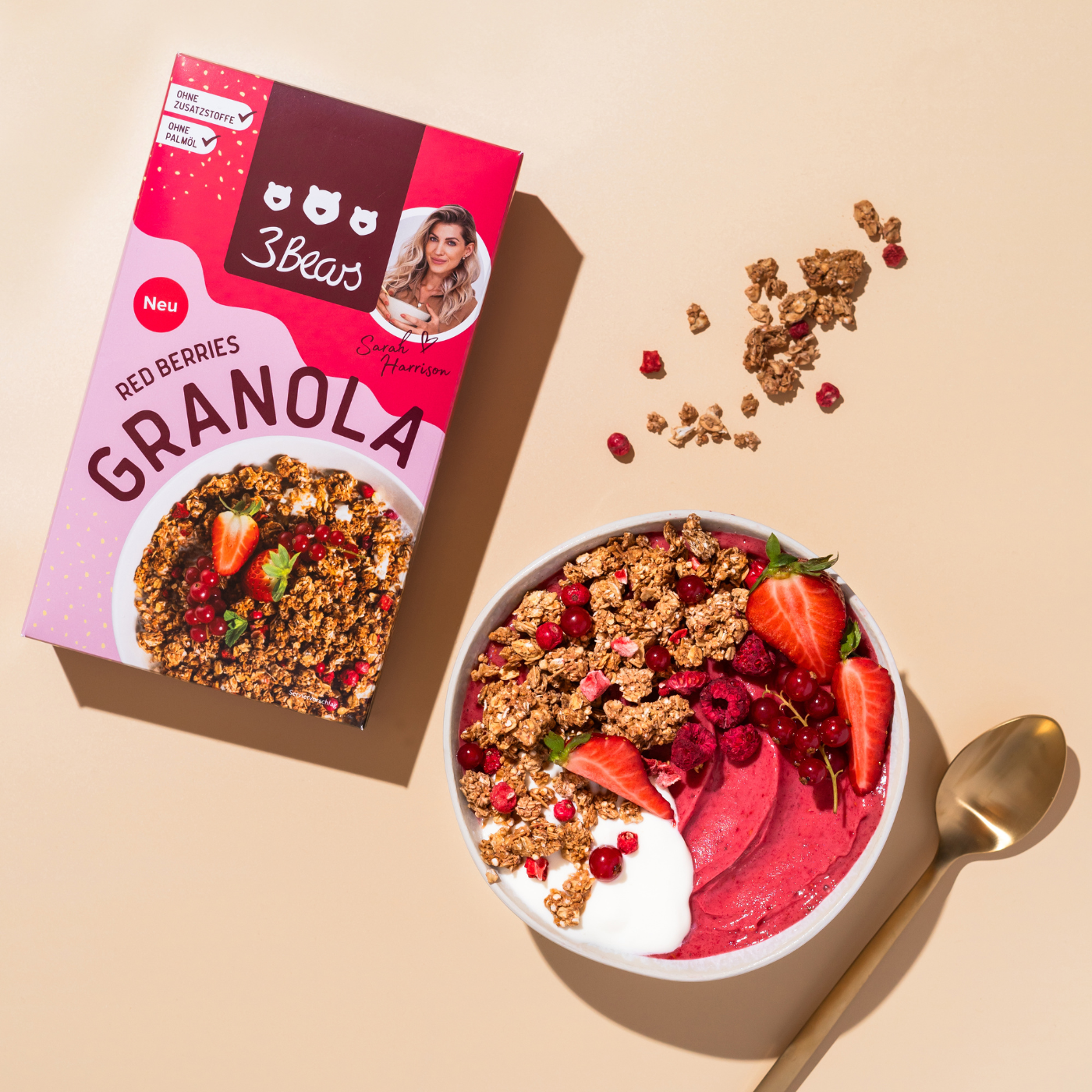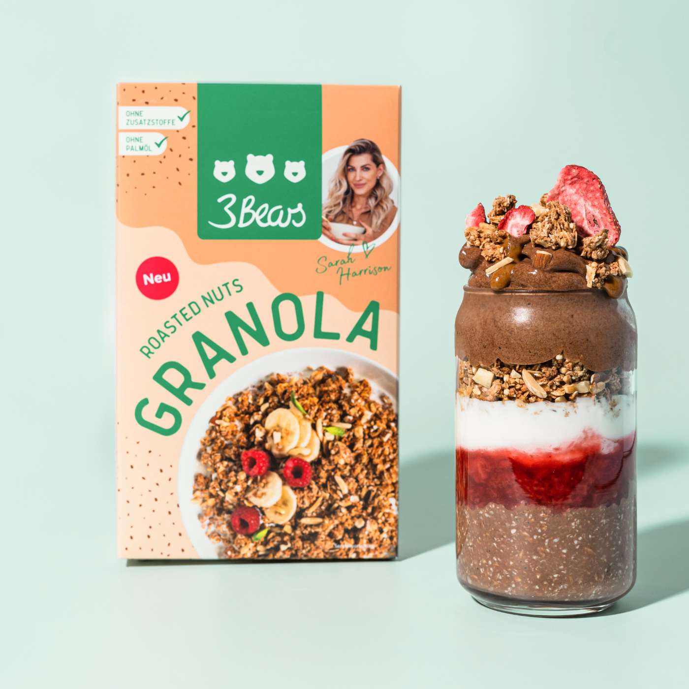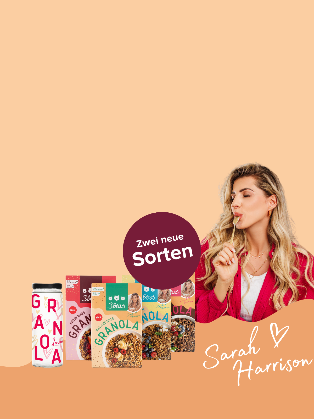 Das sagt Influencerin Sarah Harrison über ihr mit 3Bears entstandenes Granola: „Ich war ewig auf der Suche nach einem super leckeren, knusprigen Granola ohne Industriezucker. Leider ist es total schwer, so etwas zu finden. Deshalb bin ich besonders stolz, dass ich gemeinsam mit 3Bears zwei so fantastische Sorten entwickelt habe! Du wirst sehen, mein Granola schmeckt wie selbst gebacken und herrlich abwechslungsreich. Probier es doch mal mit Joghurt und frischen Früchten oder auch einfach pur aus der Packung!“