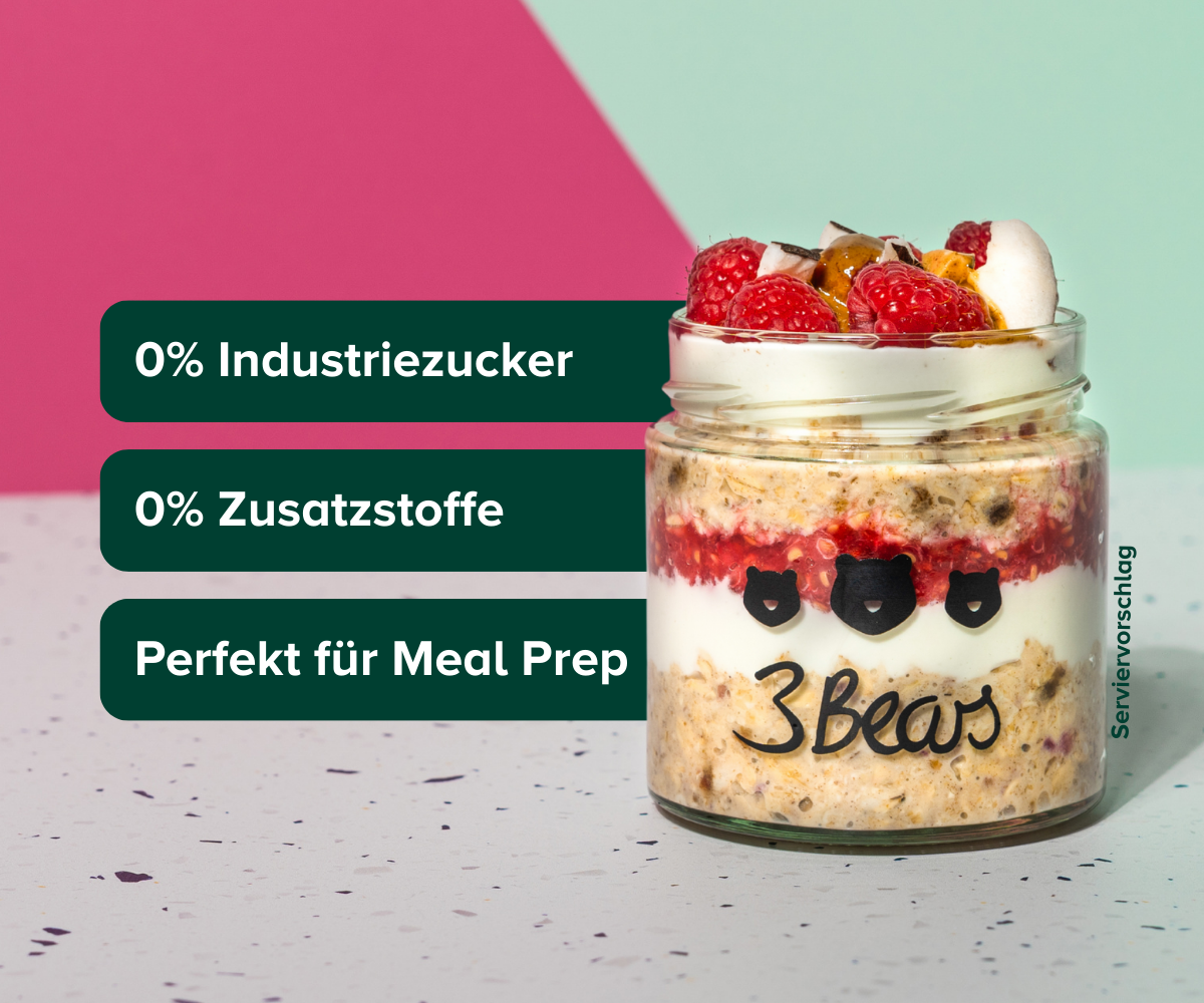 Unser Overnight Oats Glas macht dir den Frühstücksalltag leichter. Die praktischen Markierungen zeigen dir direkt im Glas, wie viel Oats, Flüssigkeit und Platz für Toppings du brauchst – ganz ohne Waage oder Messbecher. Einfach mit Milch oder Pflanzendrink mischen, für mindestens 6 Stunden in den Kühlschrank stellen und am nächsten Morgen entspannt genießen. Dein Frühstück ist vorbereitet – ohne extra Schritte und ohne unnötigen Abwasch.Easy Zubereitung