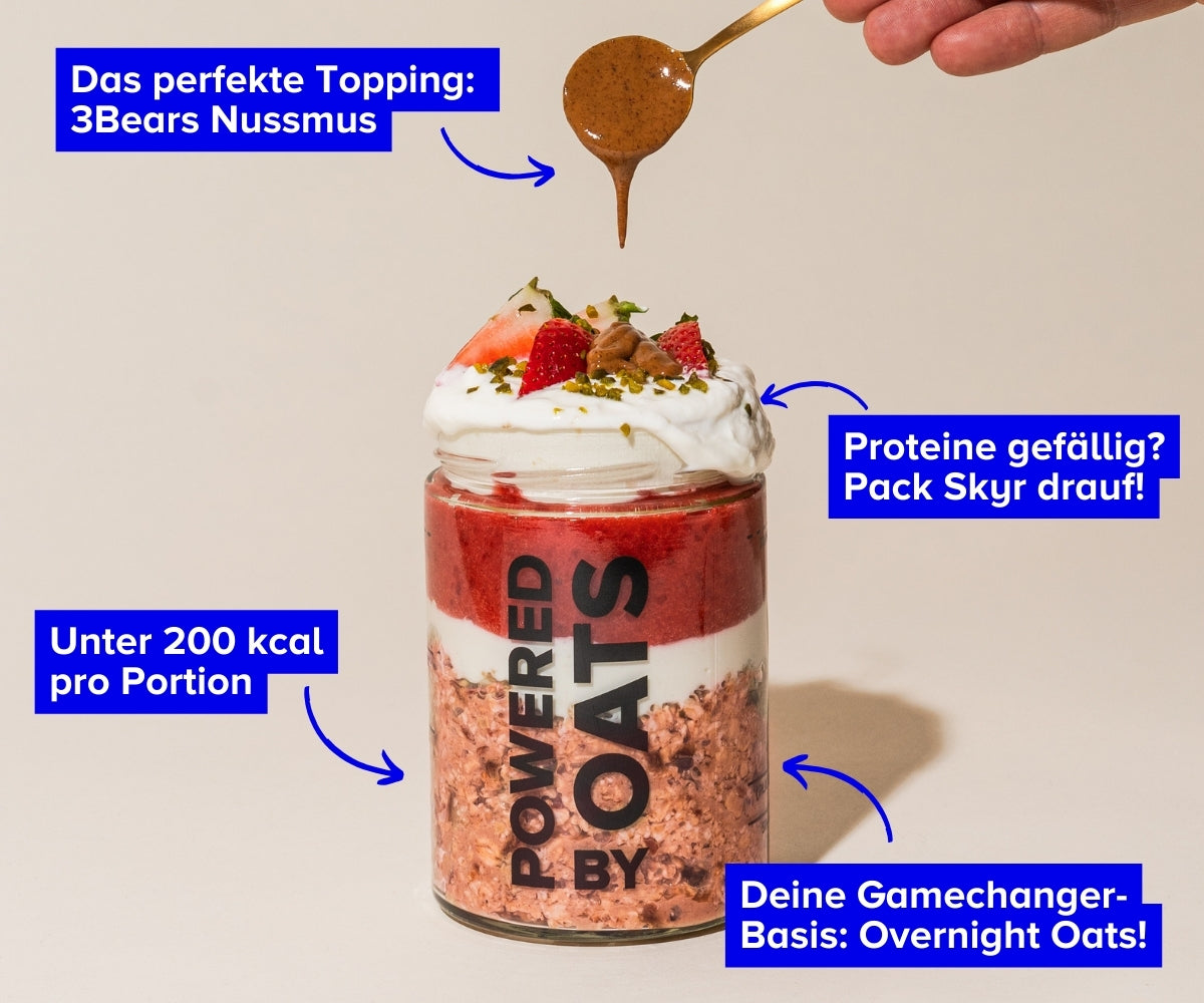 Sorry liebste Omi, aber die Kombi aus Vollkorn-Haferflocken, Erdbeeren, Datteln, Leinsamen und Kürbiskernen macht an heißen Sommertagen selbst deinen Erdbeerkuchen kalt. 😉 Unsere Erdbeer Overnight Oats schmecken aber nicht nur oberlecker (und das komplett ohne künstliche Zusätze!). On top sind sie auch noch eine Proteinquelle (auf 100 g). Ganz ehrlich: Wir wollen nicht mehr ohne. Und wir wagen zu behaupten: du nach dem ersten Löffel auch nicht!Zutaten & Nährwerte